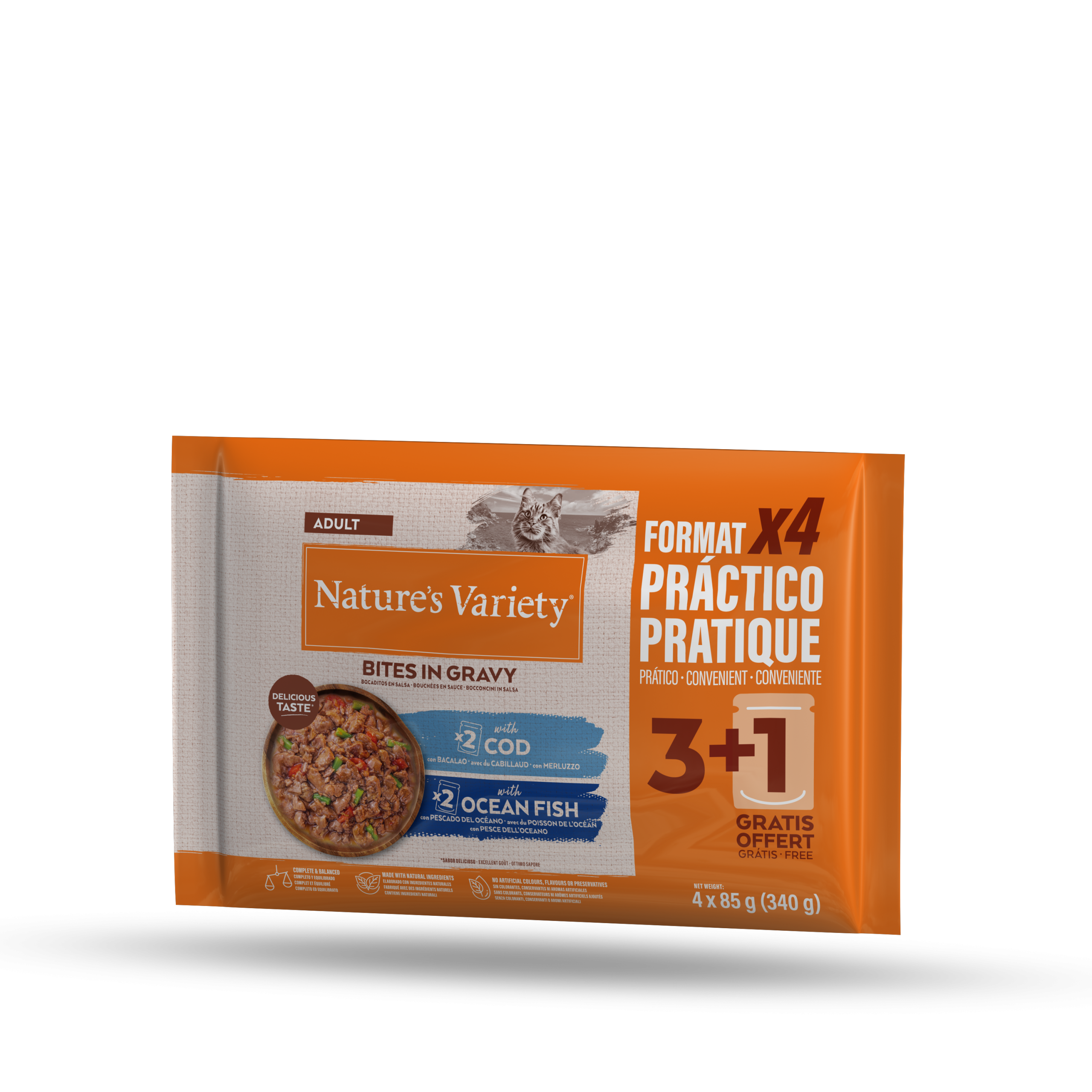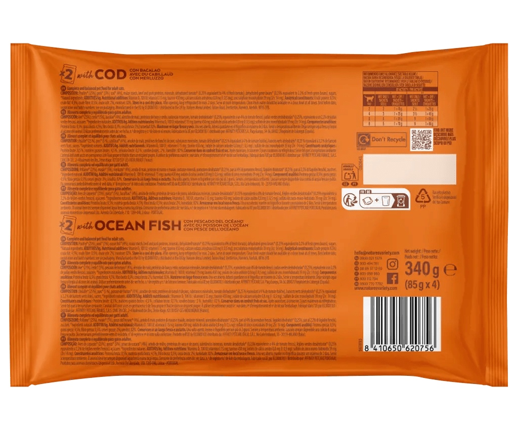 Bocaditos en salsa con Bacalao o pescado del océano. Cocidos al vapor a temperatura óptima en su propio jugo para preservar mejor los nutrientesComposiciónbacalao: Ave* 25%, cerdo* 5%, bacalao* 4%, almidón de maíz, proteínas de buey y cerdo, sustancias minerales, tomate deshidratado* (0,25%, equivalente a un 4% de tomate fresco), judías verdes deshidratadas* (0,25%, equivalente a un 2,2% de judías verdes frescas), azúcares. *Ingredientes naturales.pescado del océano: Ave* 25%, cerdo* 5%, pescado del océano* 4%, almidón de maíz, proteínas de buey y cerdo, sustancias minerales, tomate deshidratado* (0,25%, equivalente a un 4% de tomate fresco), judías verdes deshidratadas* (0,25%, equivalente a un 2,2% de judías verdes frescas), azúcares. *Ingredientes naturales.