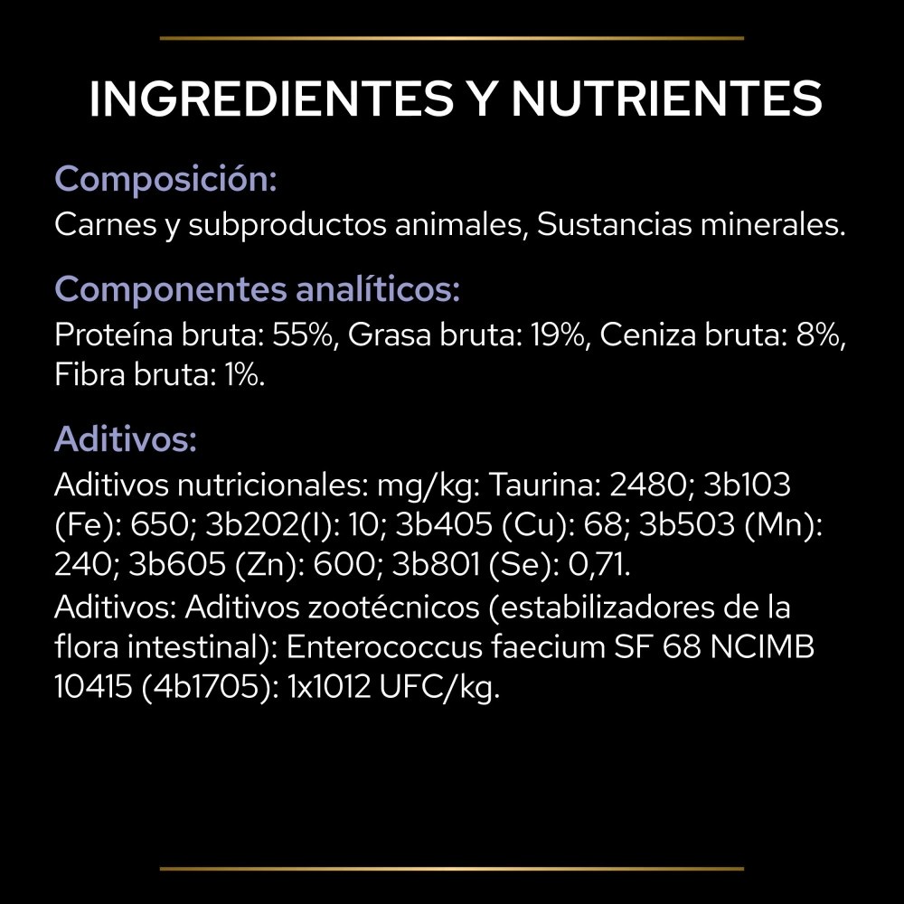 Otros ingredientes clave que contribuyen a su fórmula y palatabilidad: Carnes y subproductos animales(cerdo y aves de corral), Minerales, Vitaminas (Vitamina E y Vitamina C) y Taurina.