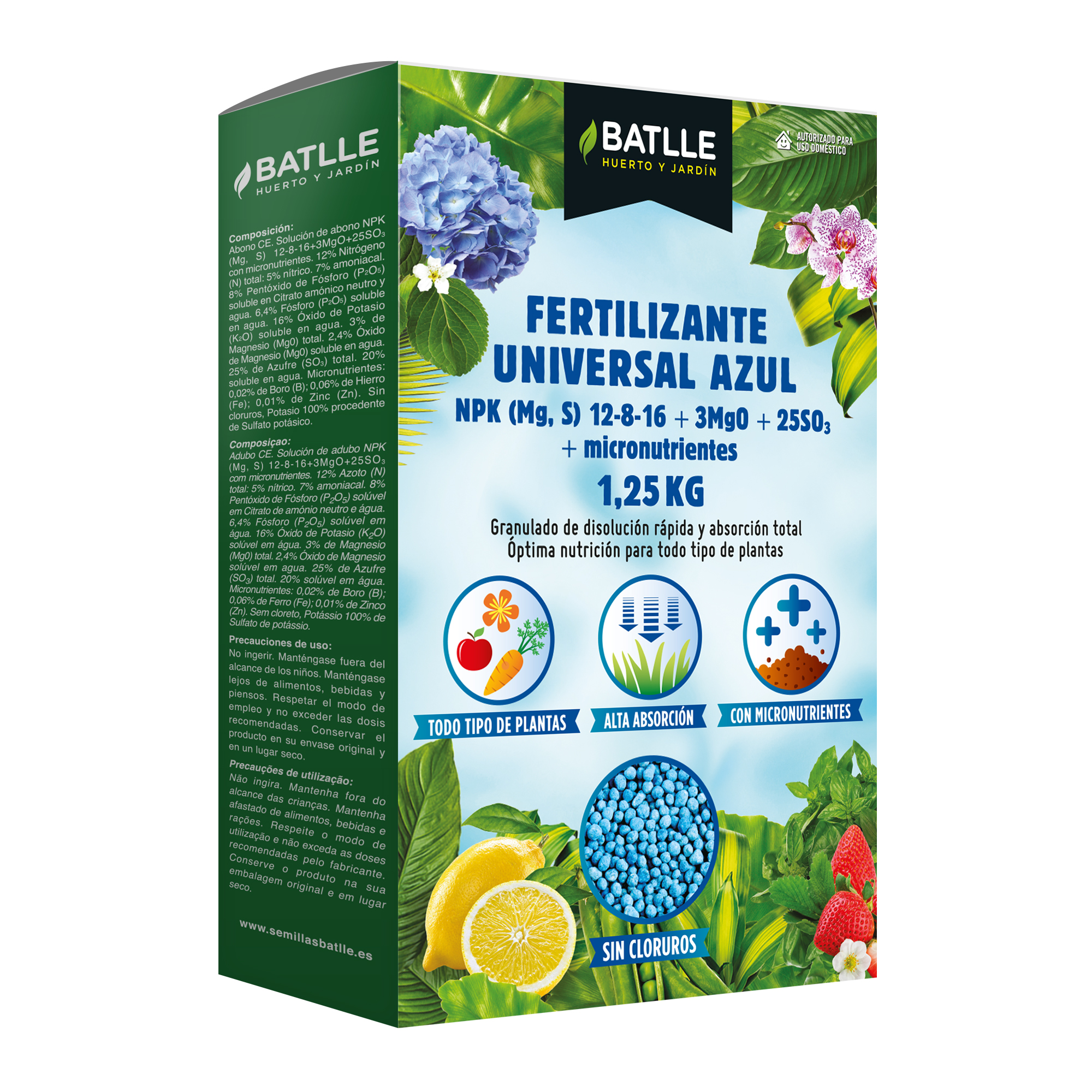El abono equilibrado para un crecimiento total. El Fertilizante Universal Azul de Batlle es un abono complejo granulado diseñado para aportar una nutrición constante y completa a todo tipo de plantas, ya sean de exterior, interior o huerto. Su formulación asegura que cada gránulo contenga el equilibrio necesario para potenciar el crecimiento, la floración y el desarrollo de las raíces de forma homogénea.