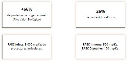 Proteína bruta 24%, Grasa bruta 12%, Materia inorgánica 6,5%, Fibra bruta 2,8%, Humedad 10%, Calcio 1,2%, Fósforo 0,78%, magnesio 0,085%, Vitamina A 20000 IU/kg, Vitamina D3 2000 IU/Kg, Vitamina E (α-Tocoferol) 115 mg/Kg. EM: 3442 Kcal/Kg