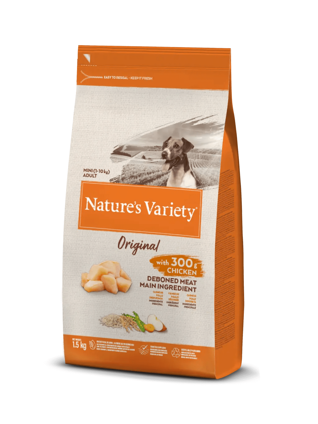 Carne de pollo deshuesada* (20%), proteína deshidratada de pollo (16%), arroz integral* (14%), avena* (13,5%), guisantes deshidratados* (13%), proteína deshidratada de pavo (8%), grasa avícola* (5%), hidrolizado de proteína (4%), pulpa de remolacha*, sustancias minerales, zanahoria deshidratada* (0,5%, equivalente a un 4% de zanahoria fresca), manzana deshidratada* (0,3%, equivalente a un 2% de manzana fresca), aceite de pescado* (0,2%)., *Ingredientes naturales.