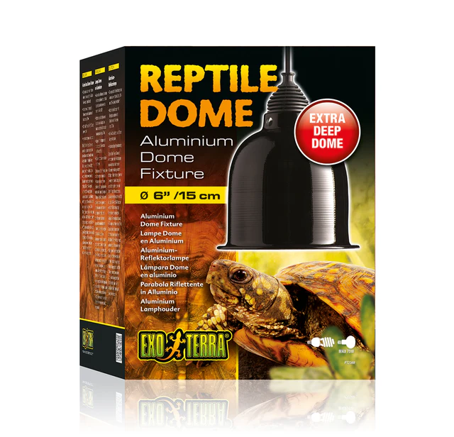 La Exo Terra® Reptile Dome tiene una cúpula reflectora de aluminio extraprofunda que cubre de sobra la cara de la mayoría de las bombillas. El portalámparas Reptile Dome te ofrece la versatilidad de colocar fuentes de calor y/o luz en tu terrario donde sea necesario. El reflector de aluminio aumenta significativamente la salida de luz y de rayos UVA y UVB. Su casquillo cerámico resistente al calor puede alojar bombillas fluorescentes compactas o bombillas incandescentes (PT2348: máx. 75 W / PT2349: máx. 160 W). La luz se enciende y apaga fácilmente con el interruptor de encendido/apagado, montado en el cable de alimentación extralargo (180 cm). Combina varios portalámparas con bombillas específicas para crear el sistema de iluminación ideal. Visita la sección de iluminación para obtener información sobre los requisitos de iluminación de tu animal.
